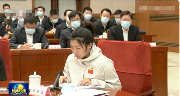 张译左边坐的正是奥运冠军徐梦桃,她扎着马尾更显青春活力,穿着戴着国徽的白色棉服。徐梦桃一改在综艺中诙谐幽默的形象,她正在发言,看起来十分严肃。