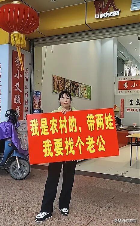 只见红色牌子上面写着醒目的:"我是农村的,带两娃我要找个老公"的征婚内容,这一幕无疑引起路人围观,有的人指指点点的,还有的人投来异样的眼光,也有的人闲言碎语的表示:"这么大的年纪还出来相亲,真丢人",为此网友议论纷纷。
