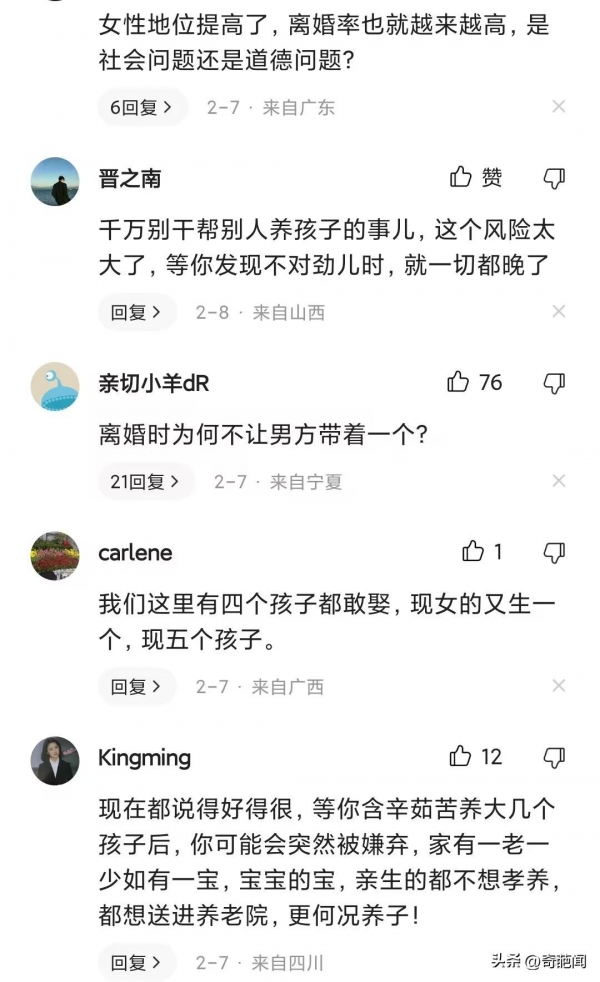 还有网友评论说,男人要有多大的勇气才敢接招,不过普遍男人一般都不会帮女人养大孩子,男人也不是傻子,除非这个女人有过人之处男人才会接受她,如果我是男人肯定也不会帮别人养孩子。