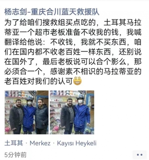 当日,重庆合川蓝天救援队队员杨志剑在社交媒体分享了一段暖心经历。其称,他在马拉蒂亚一家超市购买食物时,当地老板坚决不收钱。