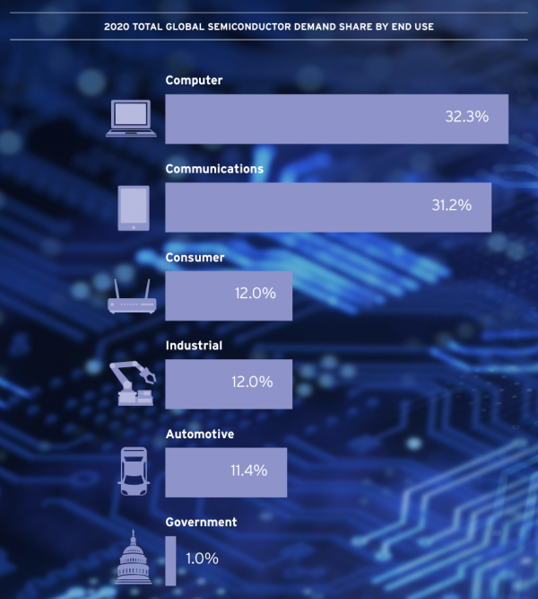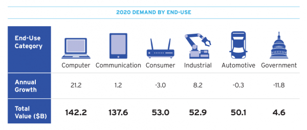 2020年,世界芯片销售总额达4404亿美元,其中最大用户是计算机,达1422亿美元,占芯片销售总额的32.3%;其次是通信,达1376亿美元,占芯片销售总额的31.2%;家电为530亿美元,占芯片销售总额的12.0%;工业电子为529亿美元,增长了8.2%,占芯片销售总额的12.0%;汽车501亿美元,占芯片销售总额的11.4%;军工、航空航天只有46亿美元,只占芯片销售总额的1.0%。
