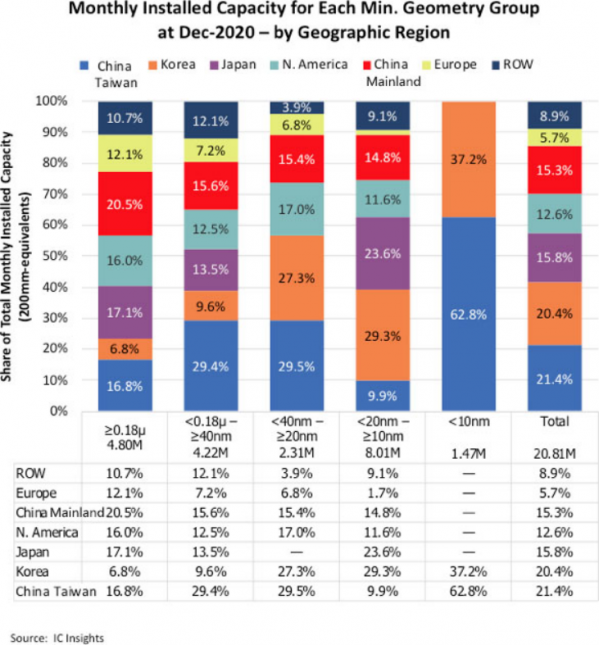 毋庸讳言,在不同技术水平的芯片里,最抓眼球的肯定是10nm以下的,尤其是5nm以下的,台积电已经在准备生产2nm了。在10nm以下,中国台湾(主要是台积电)一骑绝尘,绝对领先,占世界产能的92%。韩国三星只有区区8%。