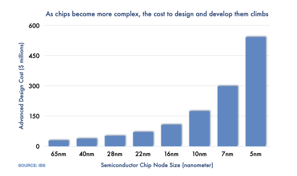 芯片的研发成本随节点尺寸的下降而急剧升高,制造成本也同步升高 图源:IBS