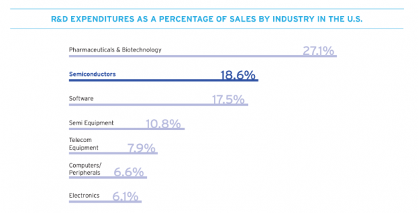 半导体是高投入产业,这还是把芯片制造设备技术另算的情况下。以美国为例,从投入占营销的比例(也称研发投资强度)来看,半导体仅次于制药和生物科技,三倍于一般电子技术,也接近三倍于计算机和外设。