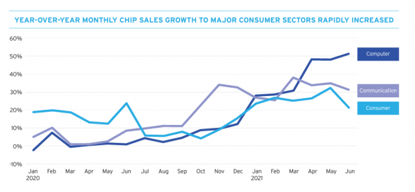 2020年初到2021年中世界半导体月销售在计算机、通信和消费电子板块的同比增长情况 图源:SIA