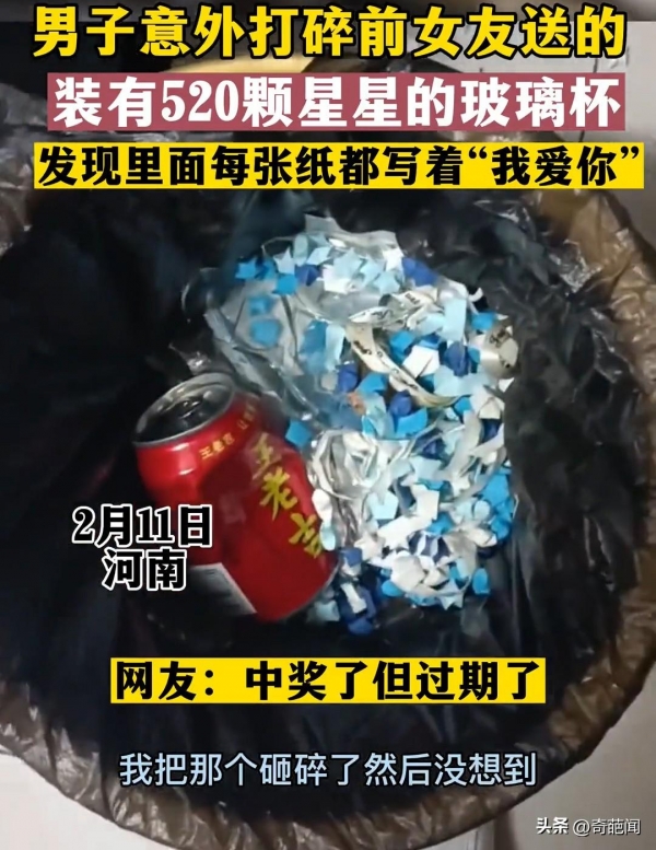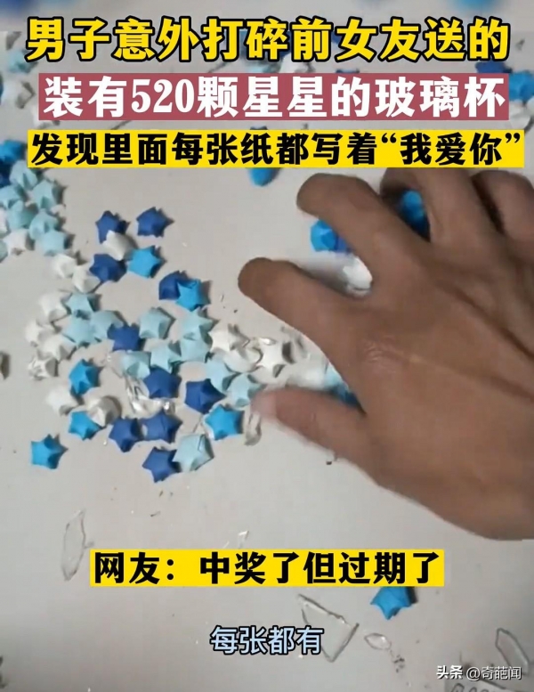 从拍摄的视频显示,画面中男子一不小心打碎了前女友送的装有520颗小星星的玻璃瓶,望着满地的蓝色小星星,本以为失去了其价值,男子刚准备将其打扫干净丢进垃圾桶里,结果却意外发现了她背后的含义。