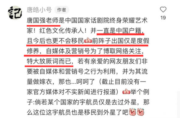针对网上沸沸扬扬的移民言论,唐国强的经纪人唐皓晒出了唐国强在国内聚会的视频,并在评论区正式辟谣。