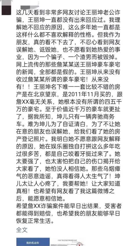 近日,有网友表示是王丽坤的好友在社交网站上发出声明,说王丽坤目前进退两难,很难熬,一直不发声回应,自身背着所有事情,但是自己作为朋友实在看不下去,希望大家能读了这篇文章后可以相信王丽坤。