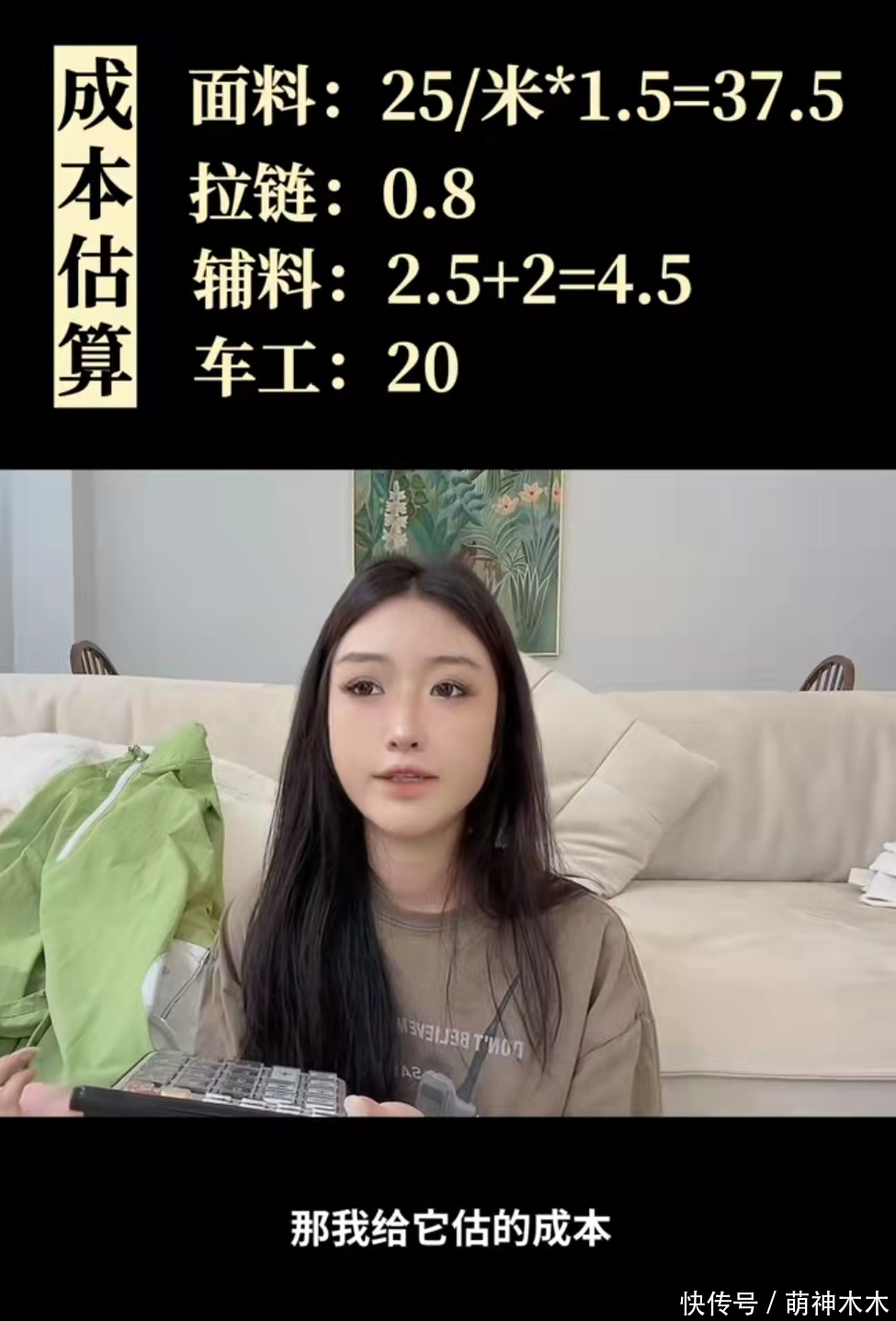 说完工艺后,设计师博主又罗列了成本,它的主体面料材质包含68%锦纶和32%棉,按照市场价25元一米算,一件衣服大概用料1.5米,总价37.5元,拉链是基础款,只能算0.8元,皮筋、金属及其他辅料4.5元,车工20元,加在一起最多60元左右,这还是按照宽松的价格算。