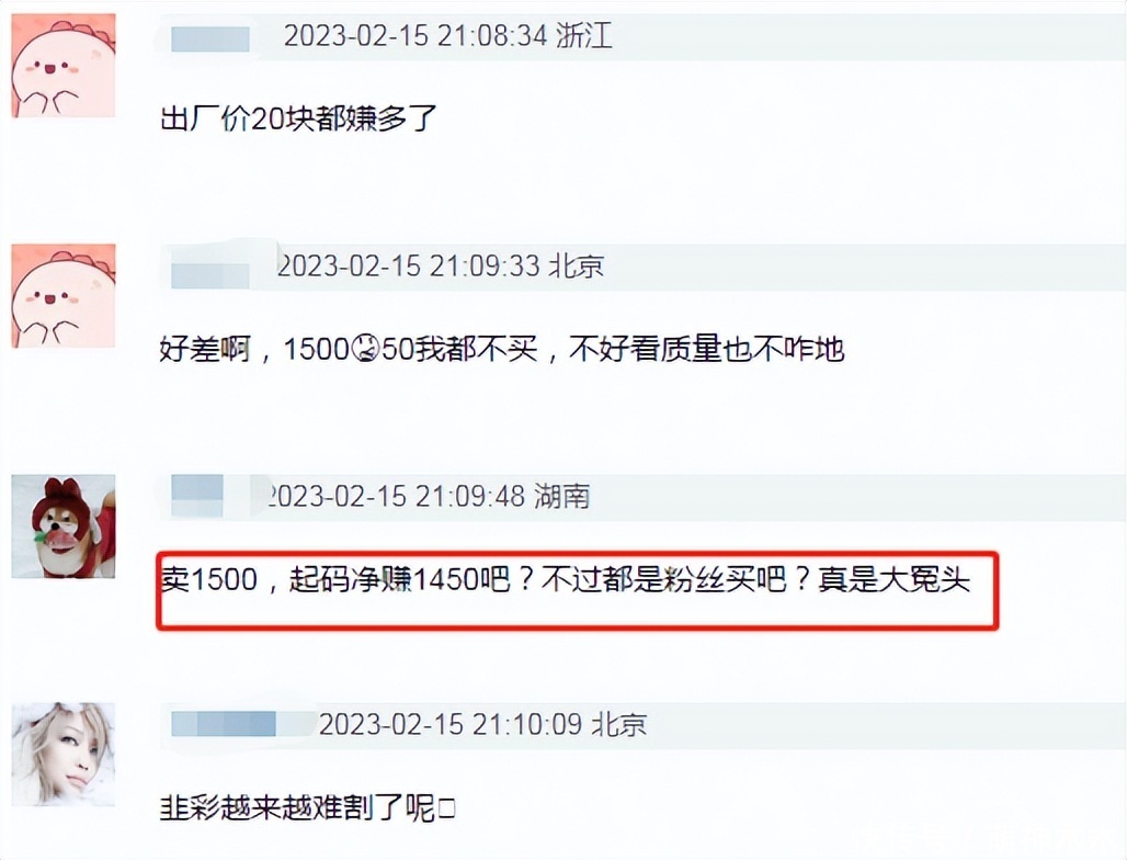 假设成本价是45元,按照1500元售价算,鹿晗一件衣服就能轻松赚1450元,被网友吐槽粉丝买的话简直就是冤大头,质量肉眼可见的差。只是,网友这种想法很多余,粉丝看到吐槽质量的说法直接反驳,称自己购买过质量很好,有质量问题找厂家,说了有啥用,还是捂嘴那一条路。