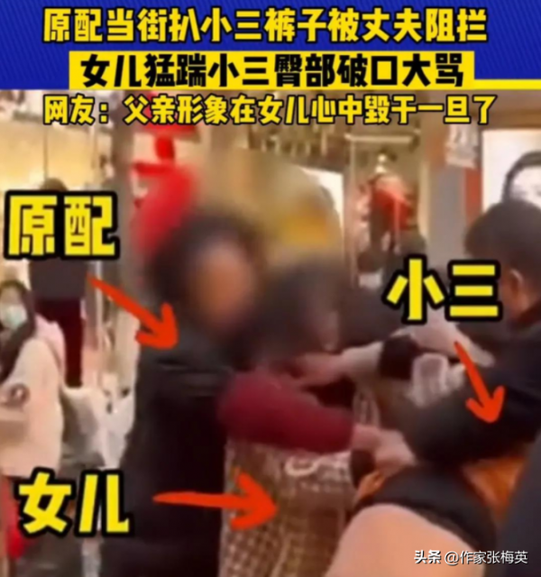 原配当街扒小三裤子被丈夫阻拦,女儿猛踹小三臀部破口大骂,被父亲动手打?