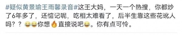 这不,就有网友喊话王雨馨"想火就直说",讽刺她一天一个热搜,炒了6年多了,吃相太难看了,难不成后半生靠这些讹人吗?