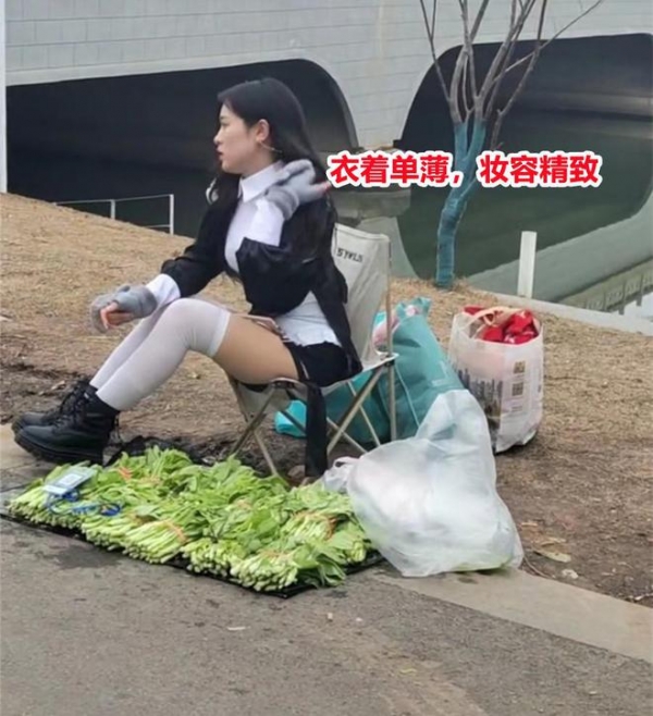 尽管天气寒冷,女主播有点儿瑟瑟发抖,时不时还去扯一下自己腿上的袜子,但她还是十分尽职尽责,全程卖力的冲着手机呼喊:"3块钱一把!3块钱一把!"