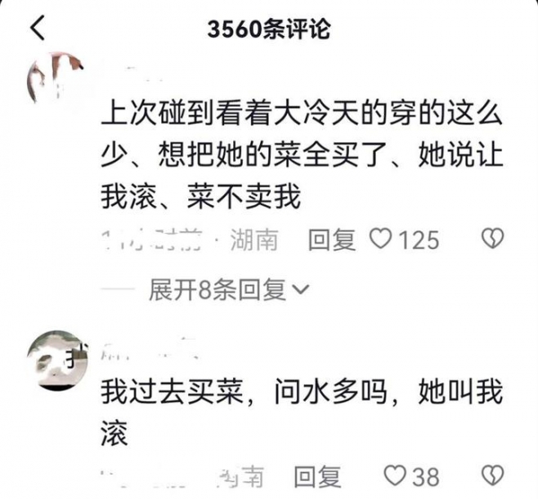 很多网友纷纷在视频下面留言表示自己也有过类似的经历,有一次他看到一位主播大冷天的穿得特别少,所以出于好心打算把菜全部买了让她早点回家,结果女主播却直接让她滚蛋。还有网友表示自己有一次也看见了,于是跑去问青菜里面水多不多,结果女主播也是让他滚。
