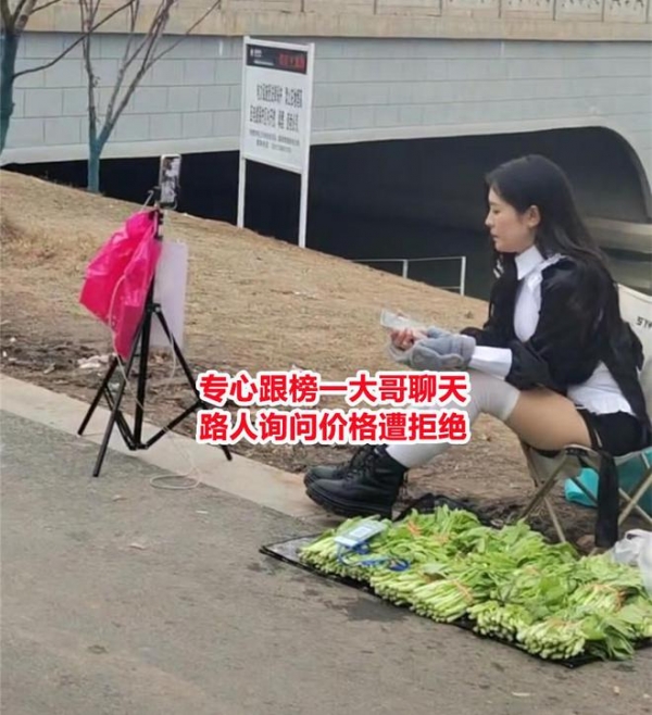 女子的衣着本就十分显眼,再加上她精致的妆容,自然是吸引了很多路人前来围观,有的甚至出于好奇直接上前问她青菜的价格,想着顺路买点儿回家,结果却被女主播直接一个白眼,十分不耐烦地表示:"没看见榜一大哥正在找我聊天吗?"