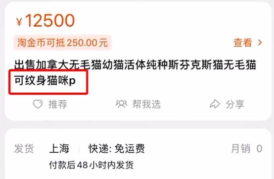 据中国新闻周刊2021年报道,调查搜索多个电商平台,发现有店家提供无毛猫纹身服务。记者联系到一名提供该服务的纹身师,一小时收费1000元,纹全身3万元。他表示自己的猫也有纹身,相比于给人纹身,给猫纹身更能显示自己的技术。