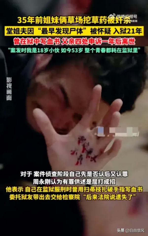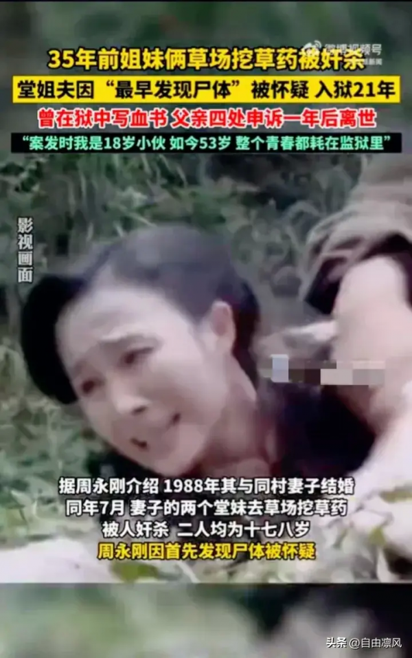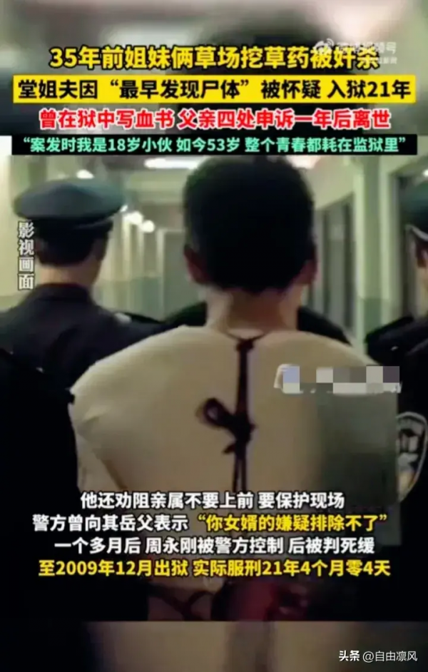 "当年案发时,我不过18岁,而今年我已经53岁了,整个青春都耗在了监狱里…"--据周永刚的讲述,在1988年,他和本村女子结婚,就是现在的妻子。当年的7月,妻子的堂妹两人结伴去了当地草场挖掘草药,而后被歹人奸杀,当时受害二人,均为十七八岁左右。