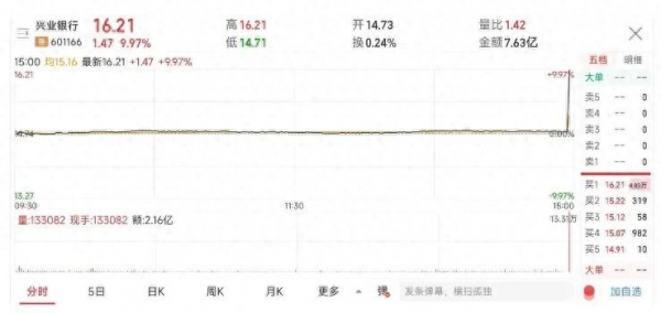 12月29日A股波澜不惊,在上交所挂牌交易的兴业银行股价走势同样平平。不过,在收盘集合竞价(14:57-15:00)的最后三分钟里情况突变,兴业银行突然上涨9.7%直冲涨停,有神秘人花了2.16亿元将这家市值为3000亿元(市值第八大银行)的大行买到了涨停。