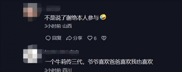 评论区有不少网友调侃道:"不是说了谢绝本人参与","一个牛莉传三代,爷爷喜欢爸爸她喜欢我也喜欢",更是表达了网友对牛莉的喜爱之情。