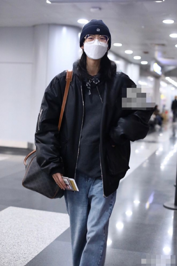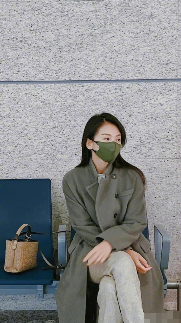 刘涛在蓝色座椅上坐着等飞机,她戴着绿色口罩,穿着灰色大衣,气质非常突出。刘涛披散着长发,看起来非常低调,状态很好。