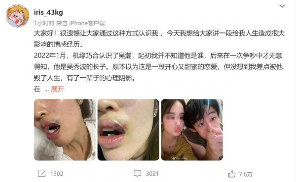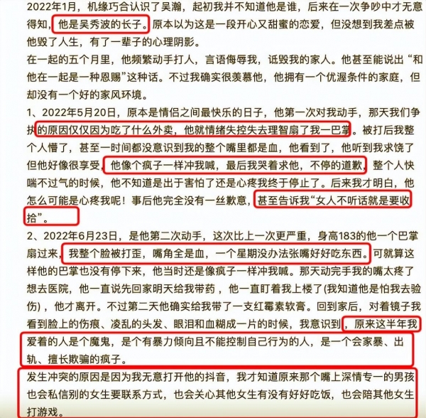 该女子表示去年1月份与吴瀚相识,最开始不知道对方的身份,后来在一次争吵中得知对方是吴秀波的大儿子。起初谈恋爱的时候对方并没有动手打人,直到520那一天,双方因为吃什么外卖发生争执,吴瀚第一次动手打了女友,女孩称当时吴瀚像个疯子一样,最后自己哭着求他不停道歉,事后还说出"女人不听话就是要收拾"这种话。
