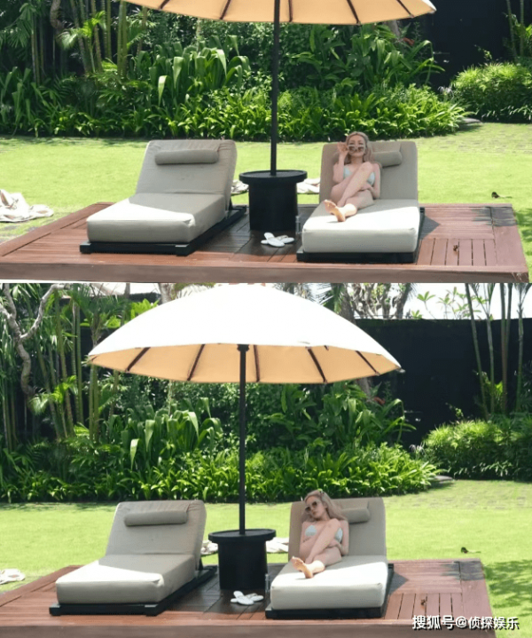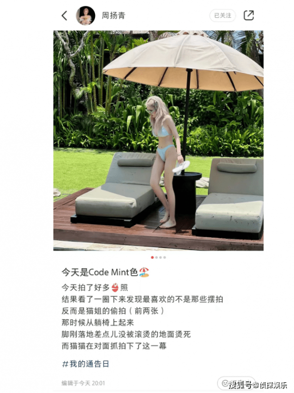 周扬青悠闲地躺在躺椅上,无处安放的大长腿全程抢镜。大家有被周扬青的比基尼look给美到吗?