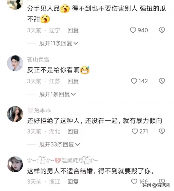 也有网友评论说,分手见人品,得不到就想毁掉,性格极端觉得自己丢了面子,就算以后他结婚了也会做极端的事。