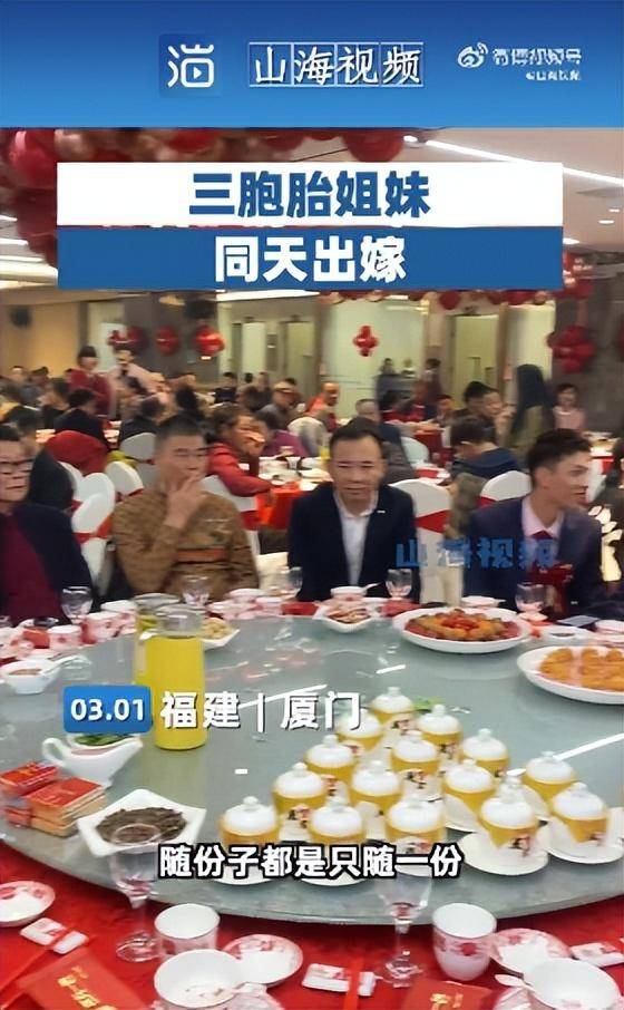 三胞胎姐妹的邻居蔡女士介绍,当天是女方这边办酒席,都是只随一份礼,男方家再各自办。"三胞胎女方家就办一场,60多桌,随份子都只随一份。新郎的话,他们各自回家各自再举办。"