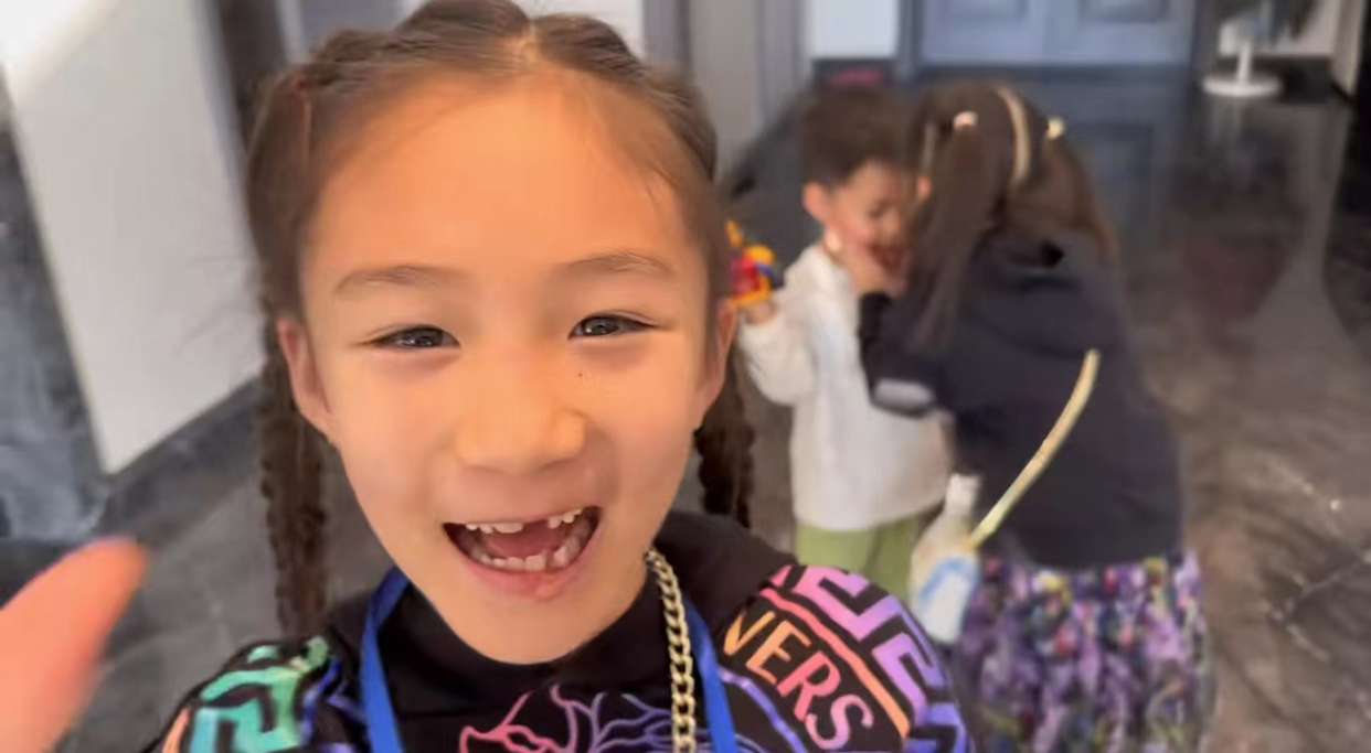 视频里,陈大愚的两个女儿穿着同款姐妹装,一个对着镜头调皮地做鬼脸,一个则在后面亲吻双胞胎弟弟的脸颊,与他们告别,很有小姐姐的模样。