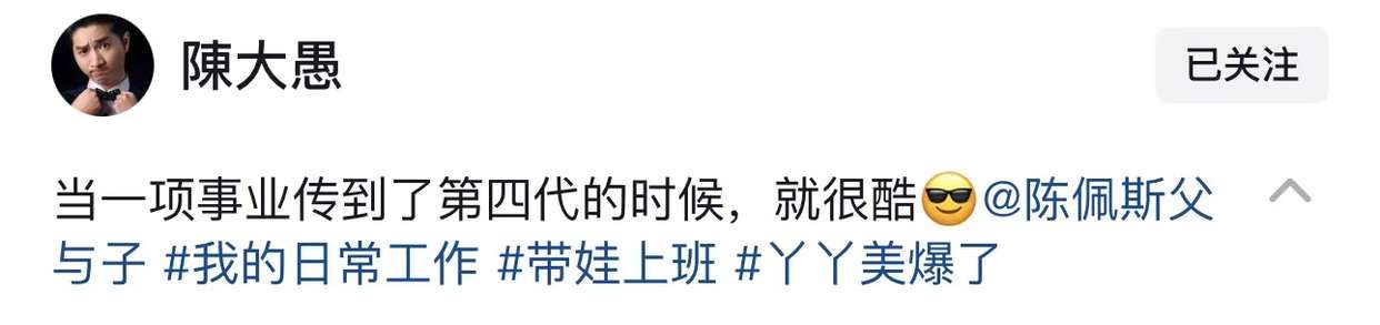 配文中,陈大愚还感慨地表示"当一项事业传到了第四代的时候,就很酷"。