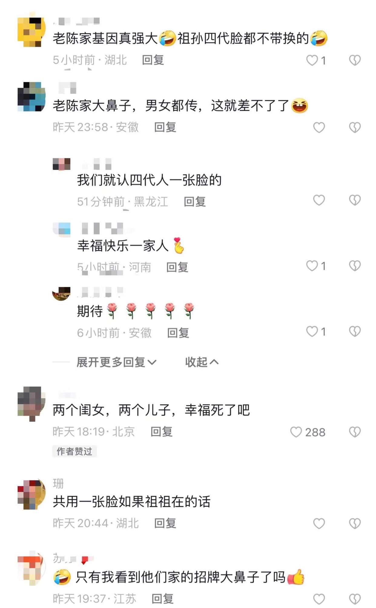 此外令人感叹的是,陈家四代人的长相非常相像,仿佛共用一张脸,特别是他们一家"祖传"的大鼻子,吸引了不少网友的关注。