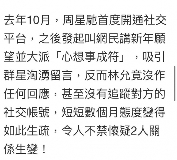 港媒称,林允应该是因为合约完结,不好意思再"碰瓷"星爷,所以才变得低调,与星爷保持距离。