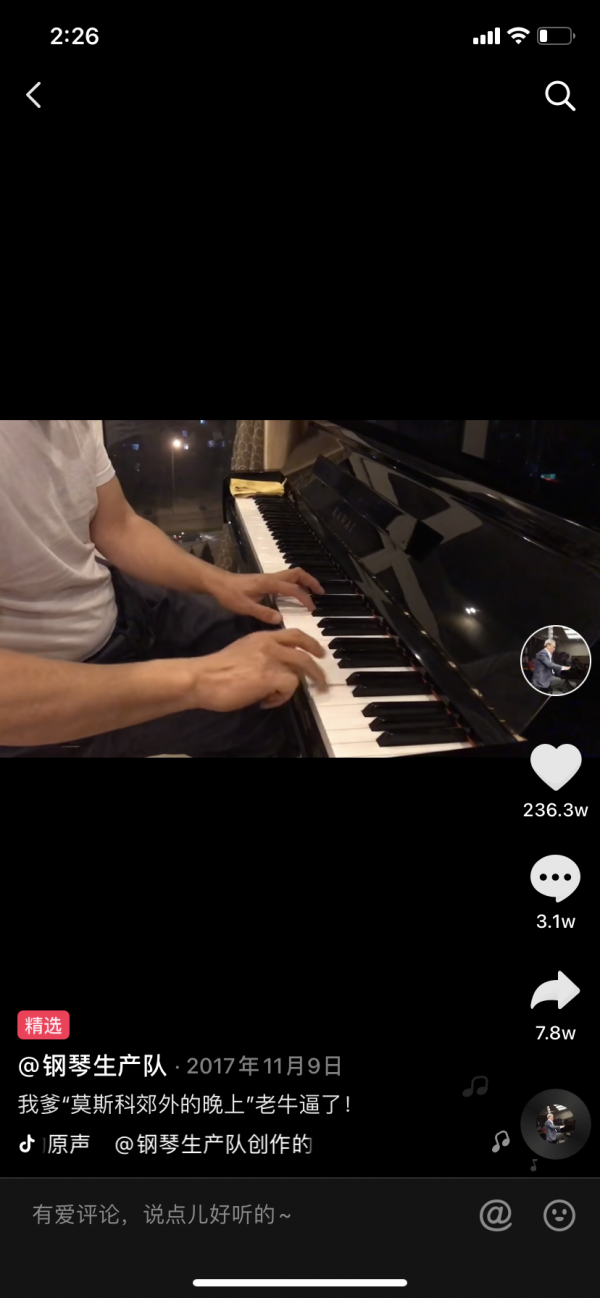 如今这条视频播放量已经超过4000万。15秒钟里,杨诉弹奏着《莫斯科郊外的晚上》,速度快得看不清手指动作。