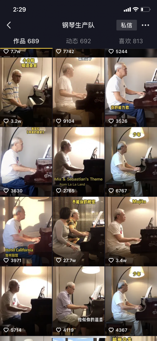 @钢琴生产队 的第一条抖音视频,诞生在2017年11月,彼时距离演奏者杨诉的58岁生日,还有3个月。