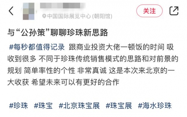 3月19日,有一位美女富婆在社交平台上晒出与任泉的合照,称自己和"公孙策"在聊与珍珠有关的话题,两人私下关系似乎很不错。