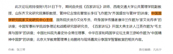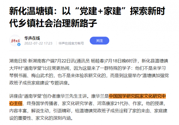 其中,"中国国学研究院家文化研究中心主任"的身份,近年来曾先后在中国甘肃网、华声在线等官方新闻机构的报道中出现。