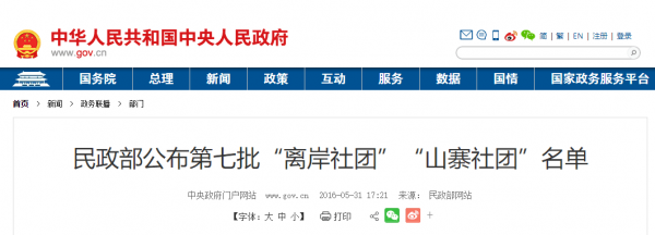 民政部2016年5月31日公布的《第七批"离岸社团""山寨社团"名单(137家)》显示,"中国国学研究院"位列第19位。