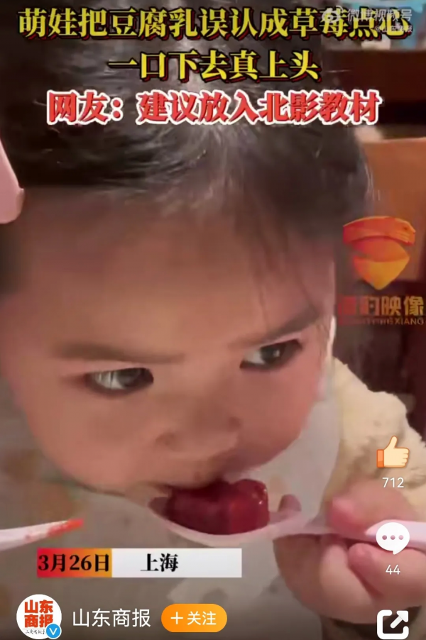 萌娃把豆腐乳误认为草莓点心 瞬间上头了
