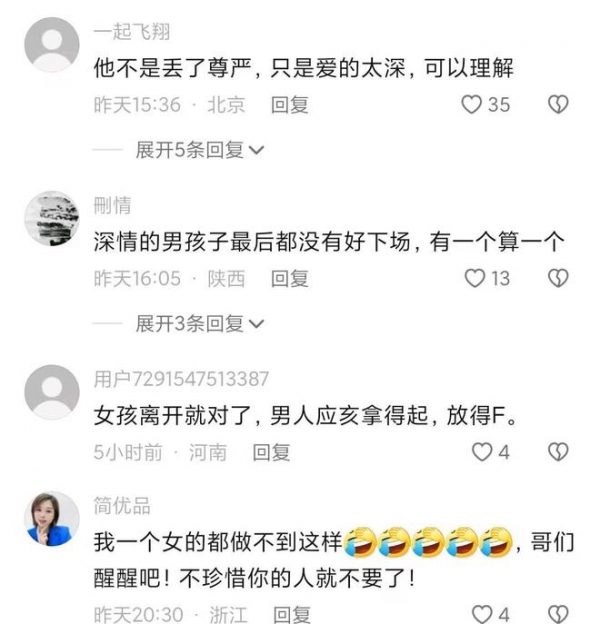 还有网友评论说,爱到极致,用情至深才会这样,让他多发泄几次吧,不然人会疯,经历过的人才懂,真的很痛的。