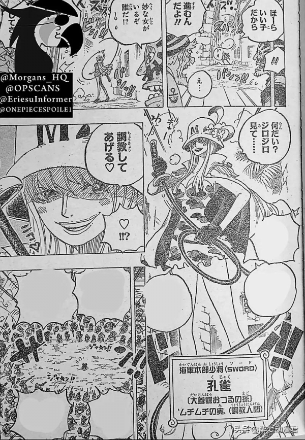 之后是鹤的孙女孔雀了,她也是SWORD的一员,而且还是超人系的"鞭鞭果实"能力者,似乎很喜欢调教别人,不过你害羞是什么意思啊?