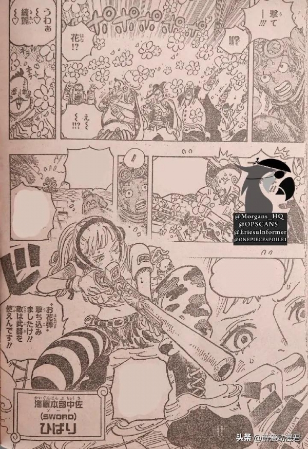 之后是云雀了,她是狙击手,她使用的武器是贝加庞克之前扉页之中获得和平奖的武器,可以直接让敌人的武器发出的子弹直接变成鲜花,确实是很离谱的发明。