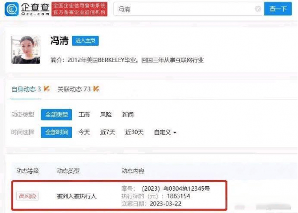 据企查查APP显示,深圳千寻魅影科技有限公司法定代表人冯清,被法院强制执行超188万元!立案日期为2023年3月22日。