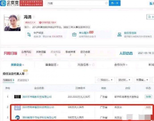 据悉,冯清目前关联有4家公司,除深圳千寻魅影科技有限公司为存续状态外,其余3家公司均被吊销。