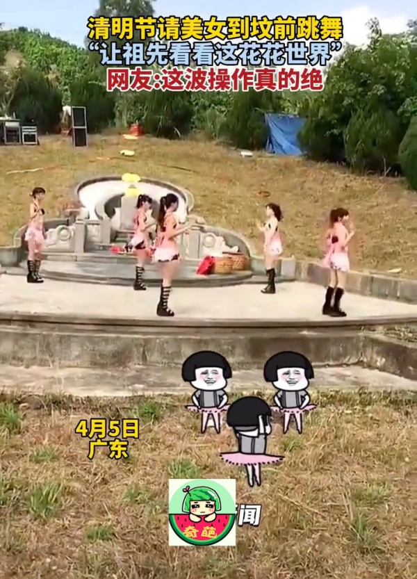 看着她们热情大方地跳着挥舞双手,抖臀扭腰,踢步等等,尽管火辣十足浑身散发魅力,但还是与坟墓周围冷清凄凉的环境有些格格不入,不少网友看完这一幕后也是被惊呆了,直呼这是想让祖宗看看外面灯红酒绿的世界。