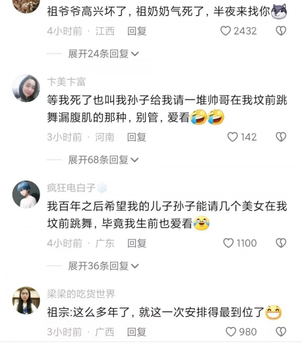 有网友评论说,我百年之后希望我的儿子孙子能请几个美女在我坟前跳舞,毕竟我生前也爱看。