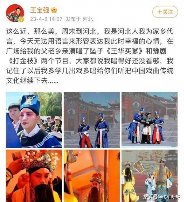 不久前王宝强被聘为"河北文旅宣传使者",将代表河北宣传文化和旅游资源,为河北地区的发展做出更大的贡献。近日,王宝强更新动态,晒出一组在老家河北登台唱戏的照片,现场火爆,心情佳。一出当地传统的坠子戏《王华买爹》以及豫剧《打金枝》获得现场朋友的热烈掌声。