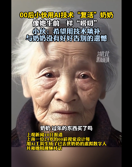 视频里,"奶奶"讲着湖北的方言,头发花白,没有牙齿,像她生前一样"唠叨"。当他问奶奶生前和他爸打电话说了些什么,这位AI奶奶都会对答如流:"我和他说,别喝酒,要节约,别打牌"。