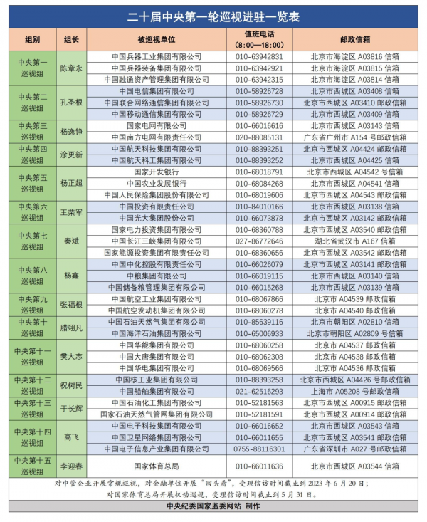 其中,常规巡视和"回头看"工作时间为两个半月左右,受理信访时间截止到2023年6月20日;机动巡视工作时间为一个半月左右,受理信访时间截止到2023年5月31日。