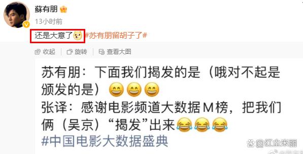 在活动结束之后,苏有朋也知道自己"嘴瓢"上了热搜,有点不好意思,于是,他在微博发了四个字:还是大意了。