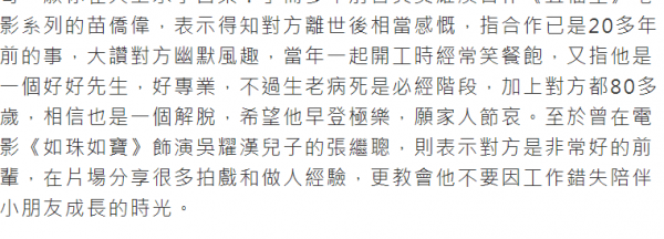 多年前曾与吴耀汉合作《福星》电影系列的苗侨伟,表示得知对方离世后相当感慨,指合作已是20多年前的事,大赞对方专业、幽默风趣,是一个好好先生,"生老病死是必经阶段,加上对方都80多岁,相信也是一个解脱,希望他早登极乐,愿家人节哀。"